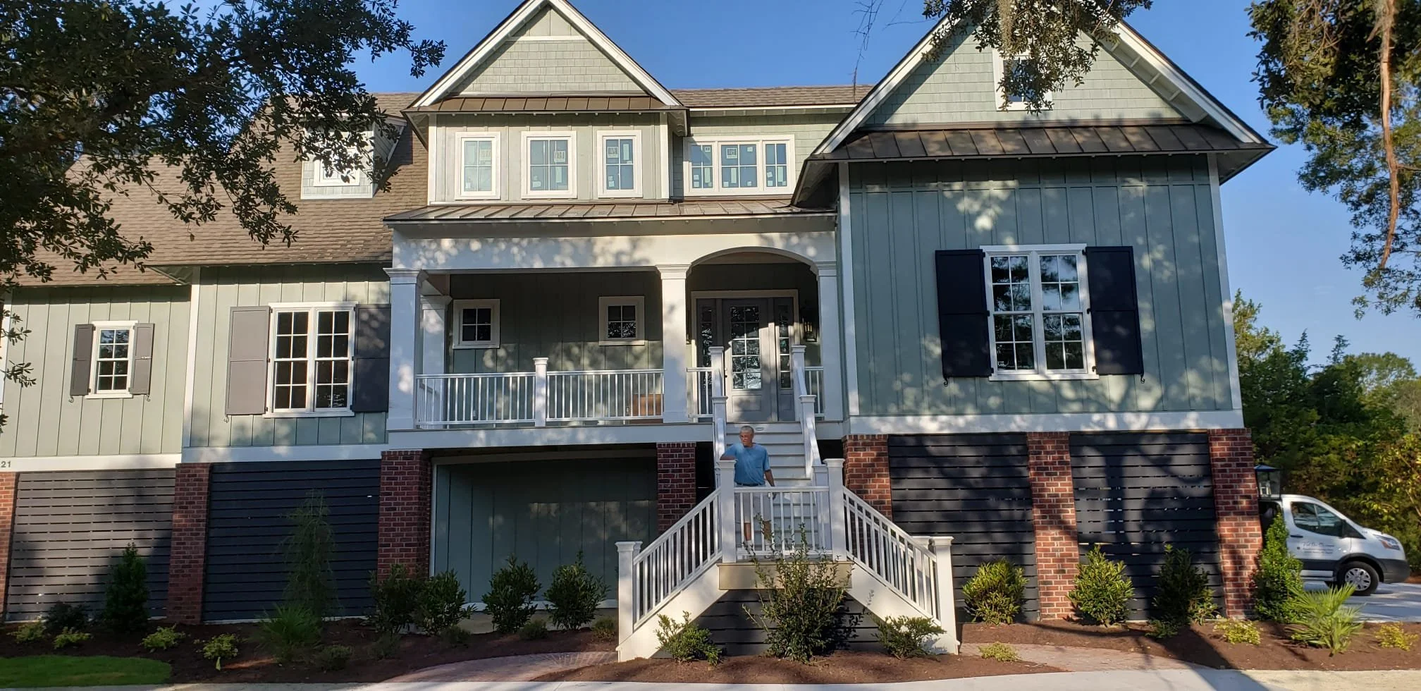 Front view of a multistory house with a man standing on the stairs, a balcony, green siding, brick accents, and a white railing, with a tree and a parked van nearby.