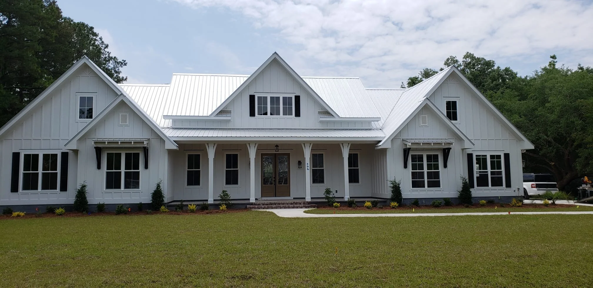 A large white house with a metal roof, multiple gables, and a front porch supported by columns, surrounded by green lawn and trees.