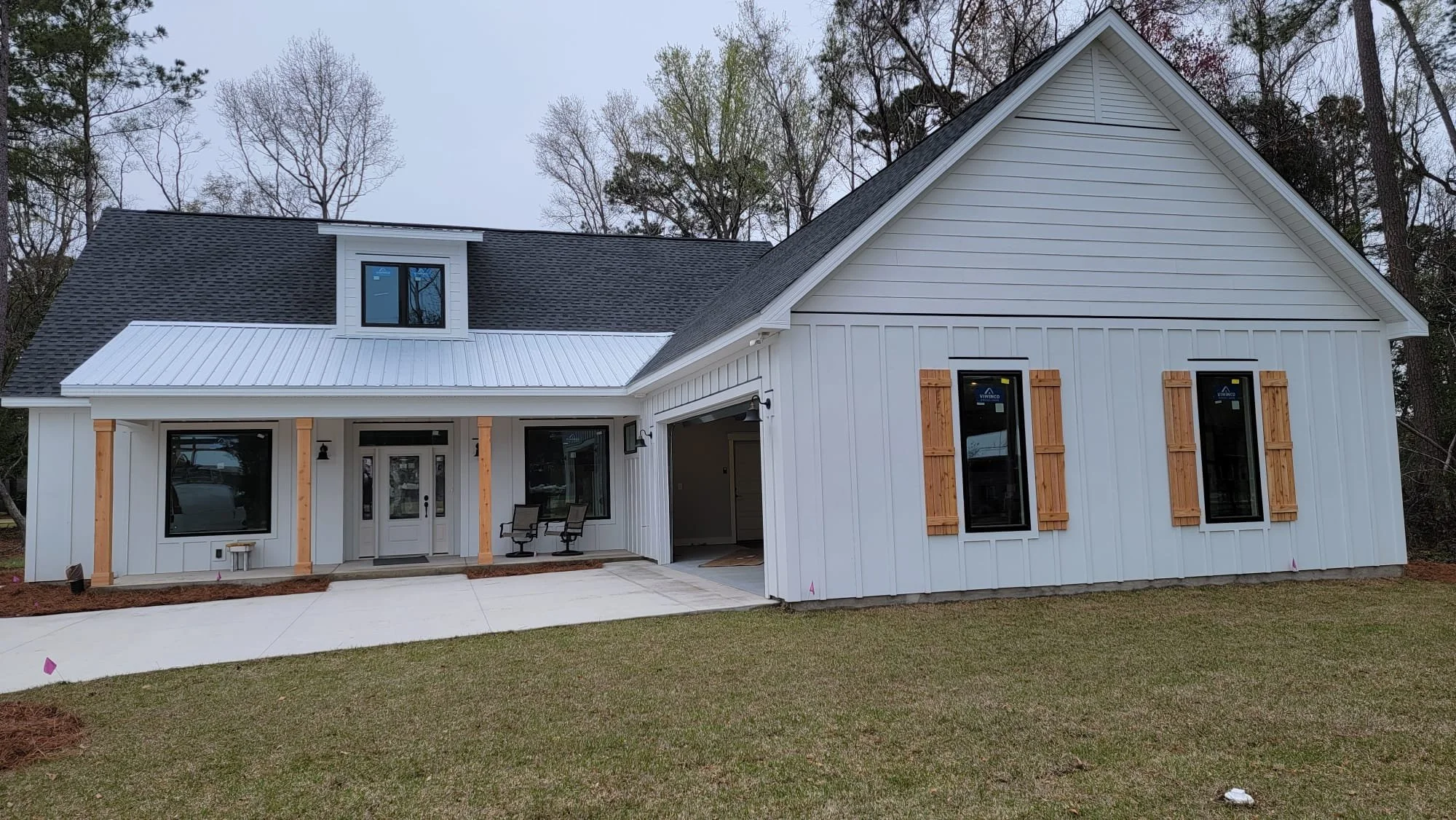 A modern house under construction with a brick and white siding exterior, a front porch, and a gable roof. The sky is partly cloudy.