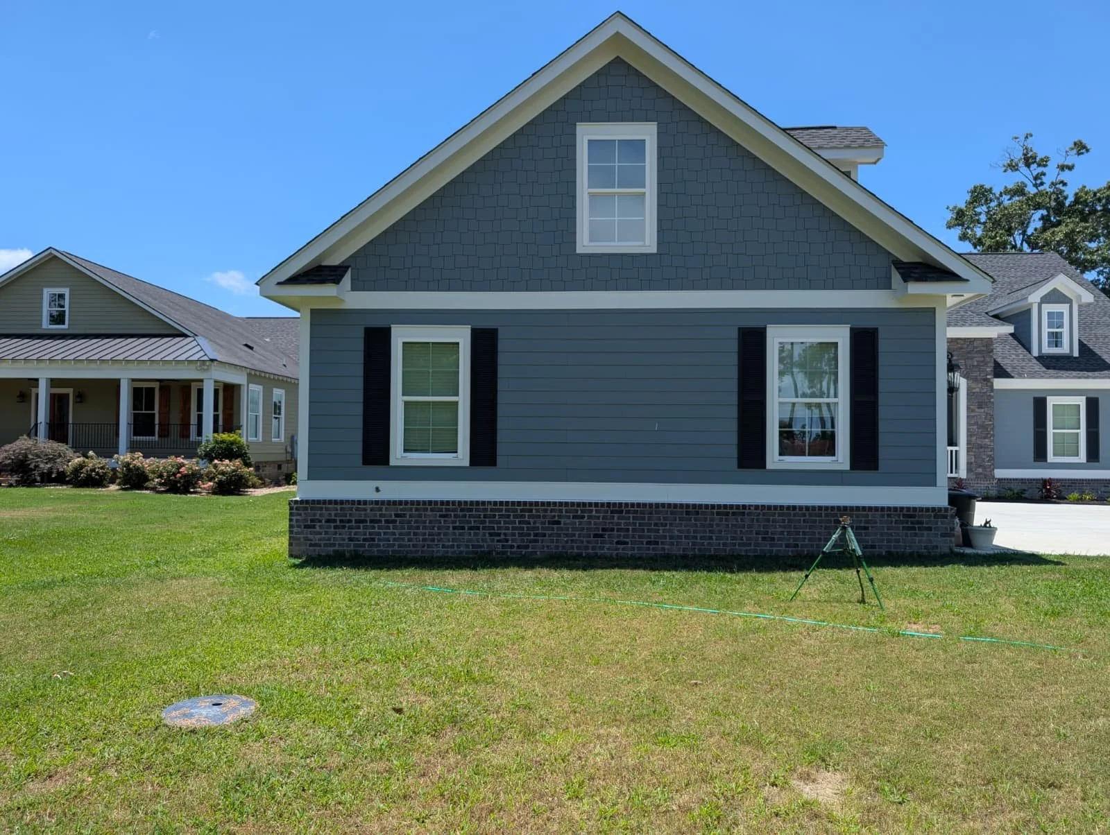 Front view of a blue two-story house with black shutters, a brick foundation, and a gable roof, situated on a grassy lawn with a clear blue sky.