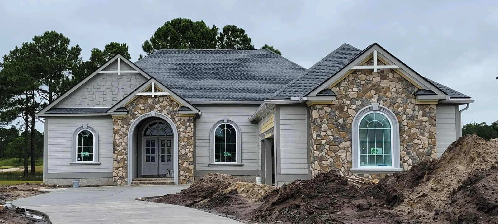 Newly constructed house with grey and stone exterior, large arched windows, front door, and partly visible driveway, surrounded by dirt piles, under a cloudy sky.