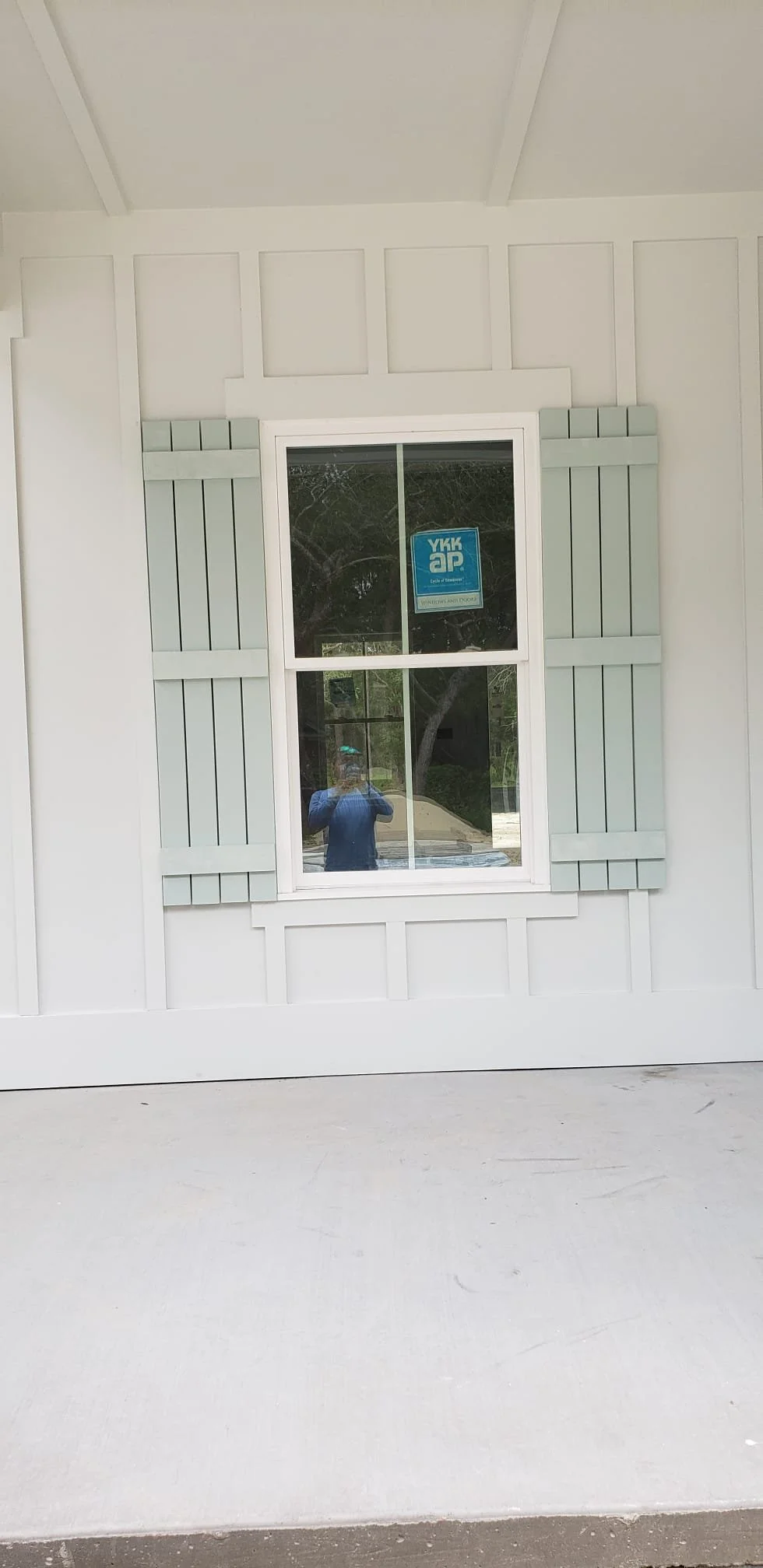 A window with closed light green shutters on a white house wall, reflecting a person taking a photo, outdoor trees, and a sidewalk.